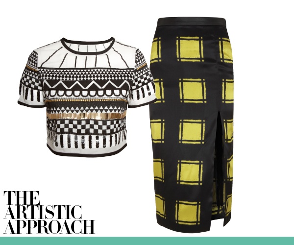 ASOS graphic embellished crop top, $99 For information: asos.com Topshop black-and-yellow check skirt, $80 Topshop, NYC, 212.966.9555 Photo: (from left) Courtesy of ASOS; Courtesy of Topshop via vogue |